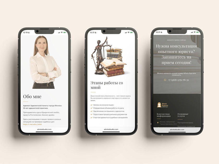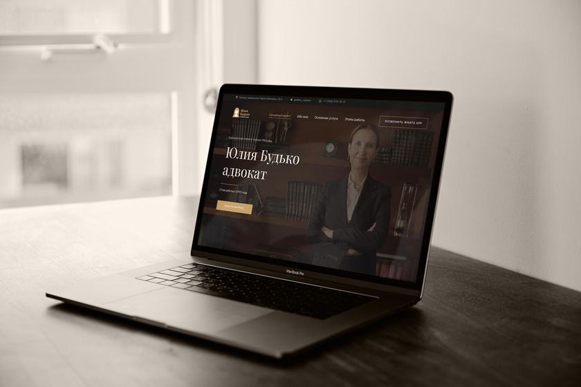 Результат: Юлия Будько получила целостный, аутентичный и работающий цифровой образ. Лендинг служит круглосуточным источником заявок, а продуманный дизайн и уникальная графика усиливают восприятие адвоката как современного, понимающего и сильного специалиста.